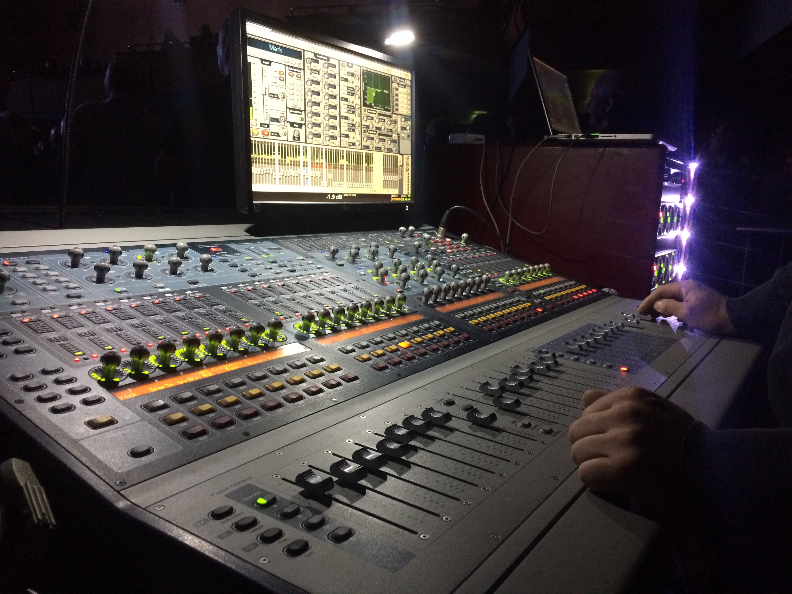 Des chose to use and Avid Profile as the front of house mixing console. The small footprint of these systems makes them ideal for this type of theatre tour where any seats lost to larger consoles equates to reduced ticket sales.
